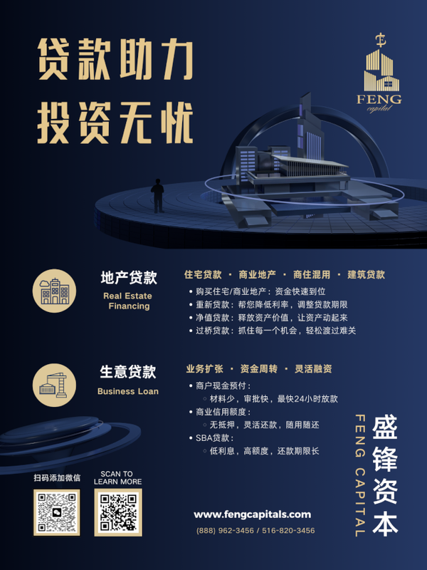 在资产配置与企业发展的关键时刻,盛锋资本为您提供最快、最专业的资金支持。我们专注为全美华人提供透明、高效、低门槛的定制化贷款方案,助力您的置业与创业梦想。